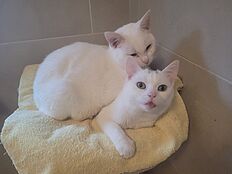 Die beiden schneeweißen Katerchen sind ein und zwei Jahre jung. Sie sind Geschwister und vertragen sich hervorragend. Obendrein sind die beiden total verschmust, fröhlich, lieb und warten nur darauf gestreichelt zu werden. Beide Brüder sind bereits kastriert, gechipt und geimpft. Sie machen gerade eine Tablettenkur, die der Tierarzt verordnet hat. Täglich eine Pille und nur noch ein paar Tage, dann ist es geschafft. Die beiden Prinzen wünschen sich ein liebevolles Zuhause und viele Streicheleinheiten. Kennenlernen ist gerne nach Verabredung im Daktari möglich.